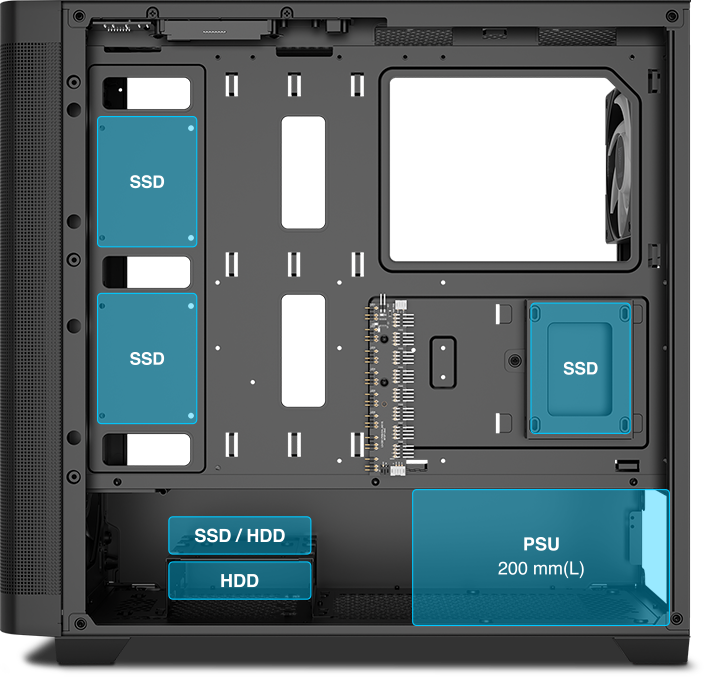 ![]() | DEPOLAMA UYUMLULUĞU İç konfigürasyon, kablo yönetimi optimizasyonu için geniş bir alana sahip ve 200 mm'ye kadar PSU uzunluklarını destekliyor. |