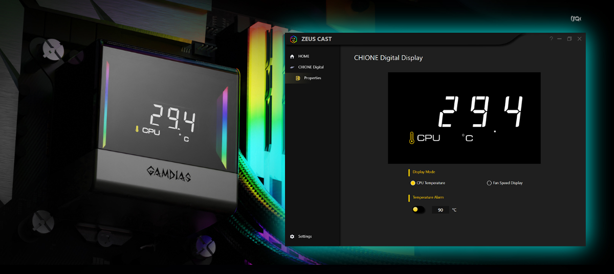 GERÇEK ZAMANLI GÖRÜNTÜLEME CHIONE E4-360, sezgisel ZEUS CAST yazılımı aracılığıyla kullanıcıların gerçek zamanlı sistem bilgilerini izlemesini sağlar. Bu çok yönlü yazılım, CPU sıcaklığı, sıcaklık alarmları ve fan hızı RPM bilgileri de dahil olmak üzere çeşitli görüntüleme modlarının seçilmesine olanak tanır. | |