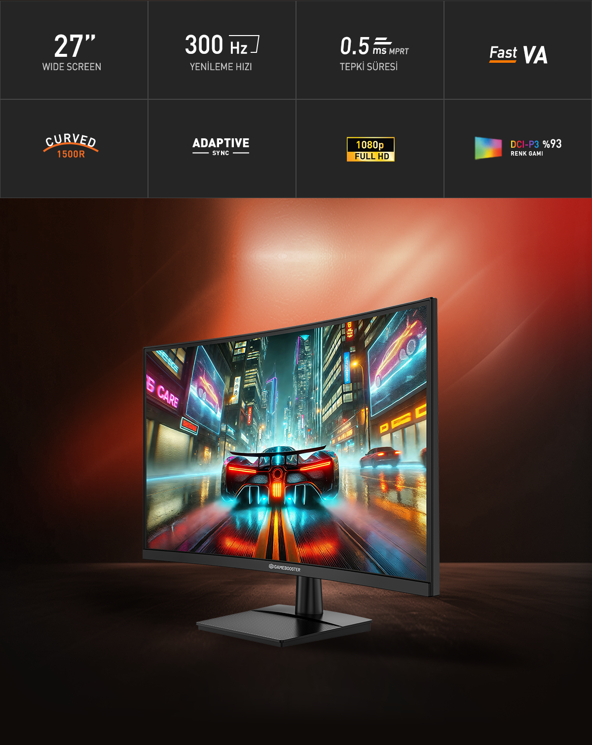 GameBooster 27” oyun monitörü Fast VA kavisli ekran paneli, 300 Hz yenileme hızı ve 0.5ms (MPRT) tepki süresi gecikmeyi ve hareket bulanıklığını en aza indirir süper hızlı akıcı oyun performansı sunar. Fast VA panel teknolojisi, %93 DCI-P3, 99% sRGB, HDR 10 desteği, 300 cd/m² parlaklık ve FHD çözünürlük , siyah ve beyaz dengesini en iyi şekilde sağlar ve daha zengin renklerle daha net film ve oyun performansı sunar. Adaptive Sync ve AMD FreeSync Teknolojisi desteği ile yırtılma ve takılma sorunları olmadan keyifli oyun deneyiminin tadını çıkarın.