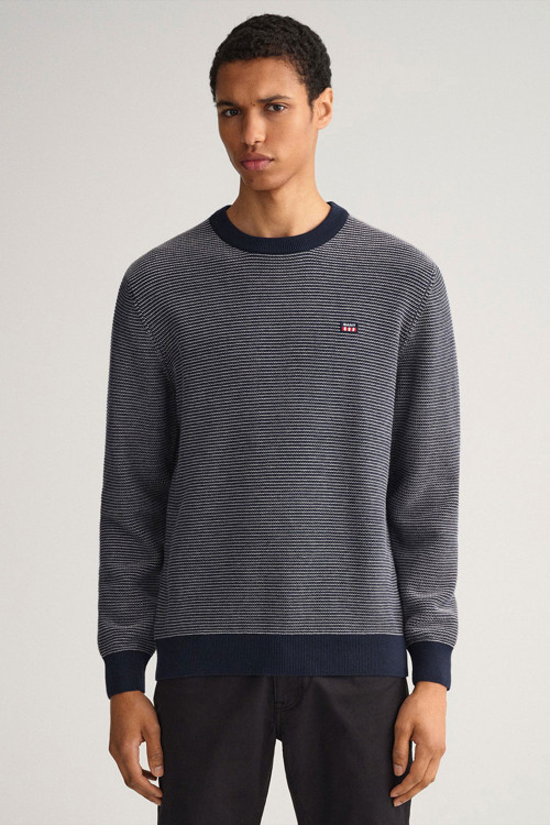 GANT'ın 8030143 kodlu ürünü, erkekler için tasarlanmış Regular Fit Bisiklet Yaka Kazak modelidir. %100 pamuk malzemeden üretilen bu kazak, çift tonlu dokusuyla sonbahar ve kış gardırobunuz için ideal bir parçadır. Regular fit kesimi, boyun, etek ve manşetlerdeki ribanalı detaylarla şıklığı tamamlanmıştır. Göğüs kısmında Retro Flag logosu yer alır.