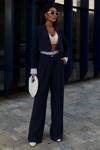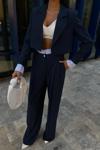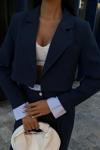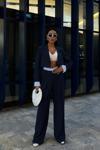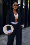 Zarif garni detaylarıyla süslenmiş, şık ve modern bir görünüm sunan lacivert crop ceketli takım.