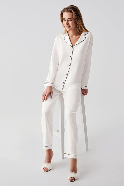 Gd Goldoremi 1035 Kadın Penye Gömlek Yaka Önden Düğmeli Gecelik Uzun Kollu Pijama Takım