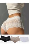 transparan Dantelli Kadın Şort Külot 3'lü Ürün İçeriği: %80 Polyamid %20 Elastan Külot Beden Ölçülerimiz: M = 38 / L = 40 / XL = 42 Yıkama Talimatları - 30 derecede elde yıkayınız - Klorlu beyazlatma ve leke giderilmesi yapılamaz - Ütülenemez.