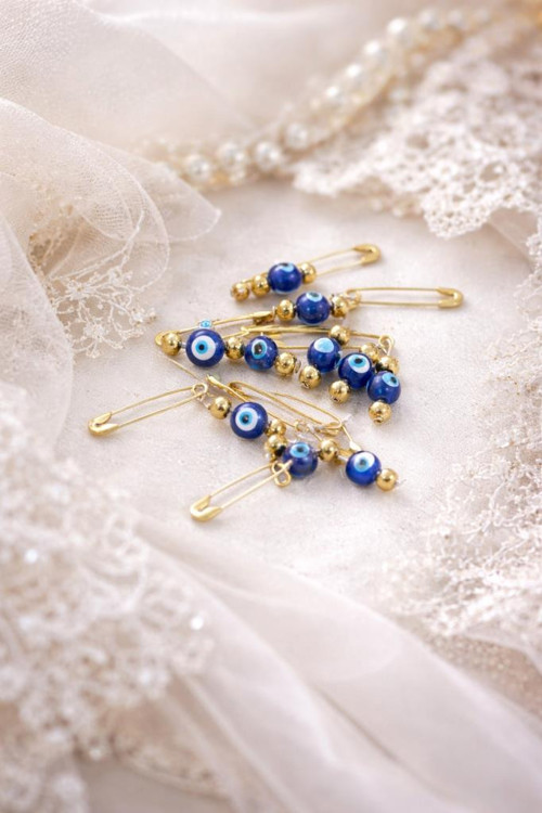 Gelin bohçası ve bebek yastığı süslemeleri için özel tasarlanmış 0.5 mm plastik nazar boncuklu çengelli iğne seti 10 adet olarak gönderilmektedir. Mini boy tasarımı sayesinde zarif ve şık bir görünüm sağlar.