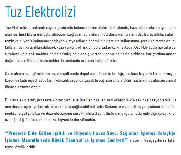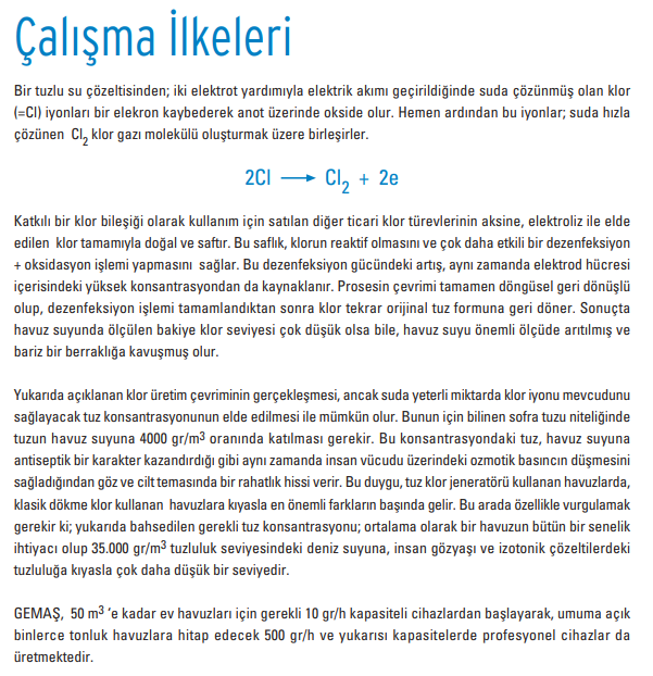 Havuz suyunda, gözyaşndaki tuzluluk ile aynı oranda tuz konsantrasyonu sağlayarak, tuzdan elektroliz yoluyla klor üreten cihazlardır. Cihaz kireçlenmeye karşı elektrodunu belirli aralıklarla temizleme özelliğine sahiptir. Sayısal ekran; çalışma yüzdesi ve akım değerini gösterir. Cihazın temizlik amaçlı kutup değişimi, suyun sertlik derecesine göre 1-8 saat aralığında ayarlanabilir. Fabrika ayarı 6 saatte birdir. Cihaz, toplam çalışma saatini hafızasında kaydeder. Elektrodlar titanyumdan mamuldur ve ortalama 14.000 saat ömürlüdür. Bipolar Elektrod teknolojisi sayesinde düşük akım - uzun elektrod ömrü. Mevcut her havuza kolaylıkla tesis edilebilir. Tüm modeller deniz suyunda da kullanılabilir. Önerilen min. tuzluluk oranı 4.000 ppm’dir. (= 4 kg/m3 ) Deniz sular›ndaki tuzluluk oranı ortalama 35.000 ppm’dir.