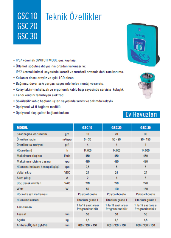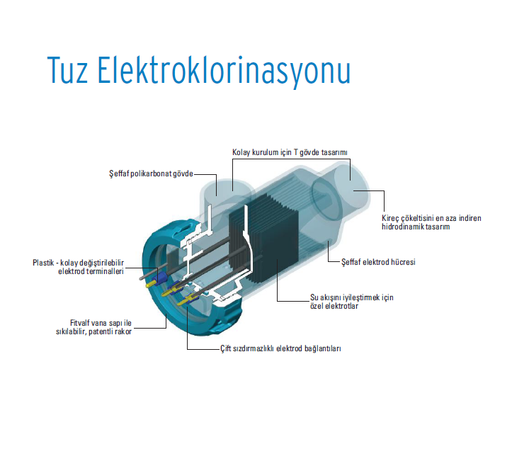 Havuz suyunda, gözyaşndaki tuzluluk ile aynı oranda tuz konsantrasyonu sağlayarak, tuzdan elektroliz yoluyla klor üreten cihazlardır. Cihaz kireçlenmeye karşı elektrodunu belirli aralıklarla temizleme özelliğine sahiptir. Sayısal ekran; çalışma yüzdesi ve akım değerini gösterir. Cihazın temizlik amaçlı kutup değişimi, suyun sertlik derecesine göre 1-8 saat aralığında ayarlanabilir. Fabrika ayarı 6 saatte birdir. Cihaz, toplam çalışma saatini hafızasında kaydeder. Elektrodlar titanyumdan mamuldur ve ortalama 14.000 saat ömürlüdür. Bipolar Elektrod teknolojisi sayesinde düşük akım - uzun elektrod ömrü. Mevcut her havuza kolaylıkla tesis edilebilir. Tüm modeller deniz suyunda da kullanılabilir. Önerilen min. tuzluluk oranı 4.000 ppm’dir. (= 4 kg/m3 ) Deniz sular›ndaki tuzluluk oranı ortalama 35.000 ppm’dir.