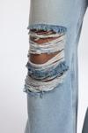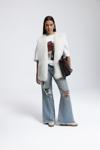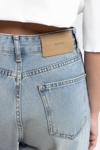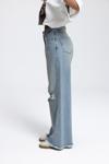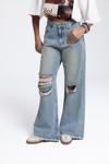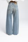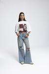 Rahat formda, düşük bel, paçası pis dikiş, dizinde yırtık detaylı. Eskitme efektli denim pantolon.