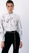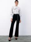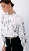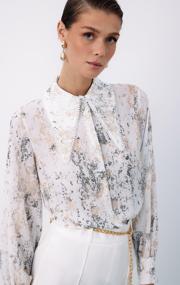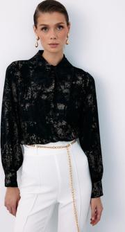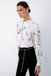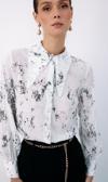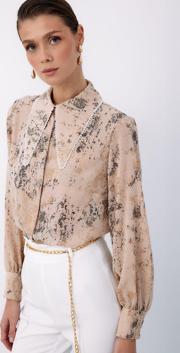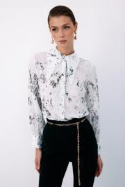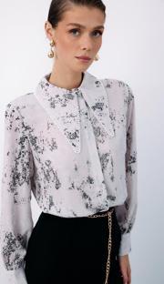 Ön gizli pat, manşetli balon kol, parlak desenli, salaş, geniş incili yaka gömlek.