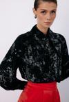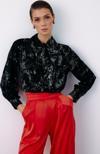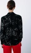 Ön gizli pat, manşetli balon kol, parlak desenli, salaş, geniş incili yaka gömlek.