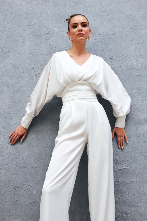 V yaka, arka bel gipe lastikli, yan fermuarlı, yarasa kol, salaş saten bluz.