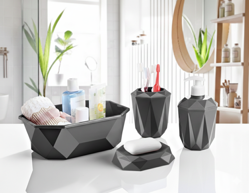Banyonuzda hem şıklık hem düzen arıyorsanız, modern geometrik tasarımlı bu 4’lü banyo seti tam size göre.