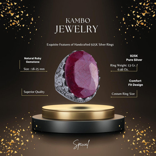 Kambo Gerçek Doğal Taş Yüzük - Gül Desenli Yüzük - 925 Ayar Gümüş Yüzük - El Yapımı Büyük Yüzük (Yakut)