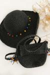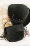 Gençlerin enerjisini ve stilini yansıtan, her yaş grubuna hitap eden tasarımıyla dikkat çeken kağıt ip el örgüsü boncuk işlemeli hasır siyah renk şapka ve çanta seti