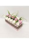 ÖLÇÜLER :27x12x12 CM Saksı içerisinde 12 adet kokulutaş beyaz lale ve 6 adet pembe lale bulunmaktadır.