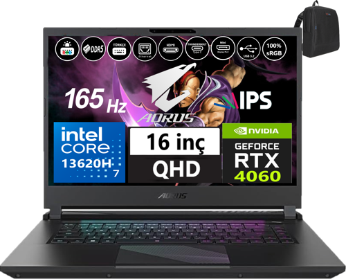 Gigabyte Aorus 15 Bkf Intel Core I7-13620H 64GB Ddr5 1tb SSD 8GB/RTX4060 140W WINDOWS11HOME 15.6" 165Hz Qhd IPS Taşınabilir Bilgisayar GB15ARSH3TR75W34+WEBLEGELSINÇANTA