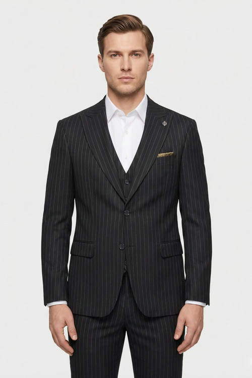 Giotelli Erkek Yelekli Viskon Karışımlı 8 Drop Klasik Siyah Takım Elbise