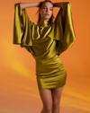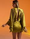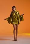 - Yağ yeşili rengiyle dikkat çeken bu saten elbise, şıklığınızı ön plana çıkarır.