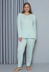 Çamaşır Kenti markasının şık ve konforlu büyük beden penye uzun kol pijama takımı, artık gardırobunuzun vazgeçilmezi olmaya aday! Su yeşili rengi ile dikkat çeken bu pijama takımı, hem şıklığı hem de rahatlığı bir arada sunuyor.