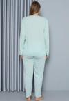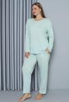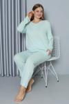 Çamaşır Kenti markasının şık ve konforlu büyük beden penye uzun kol pijama takımı, artık gardırobunuzun vazgeçilmezi olmaya aday! Su yeşili rengi ile dikkat çeken bu pijama takımı, hem şıklığı hem de rahatlığı bir arada sunuyor.