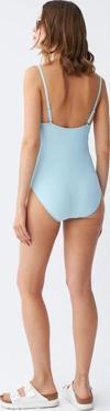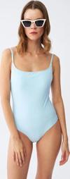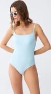 Buz mavisi rengi ile öne çıkan Çamaşır Kenti İnce Askılı Düz Tek Parça Mayo, plajda şıklığıyla fark yaratacak!