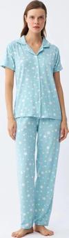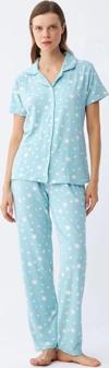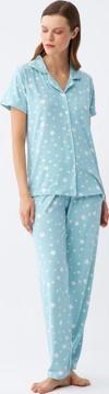 Buz mavisi rengiyle şıklığı ve yıldız deseniyle şirinliği bir araya getiren Çamaşır Kenti Kadın Pijama Takımı, konforu ve şıklığı bir arada sunuyor. Önden düğmeli tasarımıyla hem pratik hem de şık bir seçenek sunan pijama takımı, günlük kullanıma uygun. Penye kumaştan üretilen takım, yumuşak dokusuyla rahat bir gece uykusu vaat ediyor. Beli lastikli şortuyla rahat hareket etmenizi sağlarken, şık görünümüyle de beğeni topluyor. Hem şıklığı hem de konforu ön planda tutan bu pijama takımı, güne enerjik bir başlangıç yapmanızı sağlayacak.