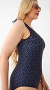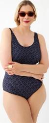 Kadın Lacivert Geometrik Desenli Büyük Beden Tek Parça Mayo, plajda şıklığı ve rahatlığı bir arada arayan kadınlar için ideal bir seçenektir. Çamaşır Kenti'nin kaliteli kumaşlarıyla üretilen bu mayo, büyük beden kadınların şıklığından ödün vermeden güneşin keyfini çıkarmasını sağlar.