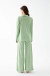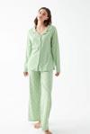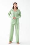 Yeşil renkteki kalp desenleriyle hareketlenen pijama takımı, feminen bir görünüm sağlar.