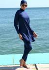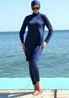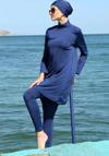 Uzun Kol Likralı Lacivert Tesettür Mayo, hem şık hem de rahat bir plaj deneyimi için tercih edebileceğiniz bir parçadır.
