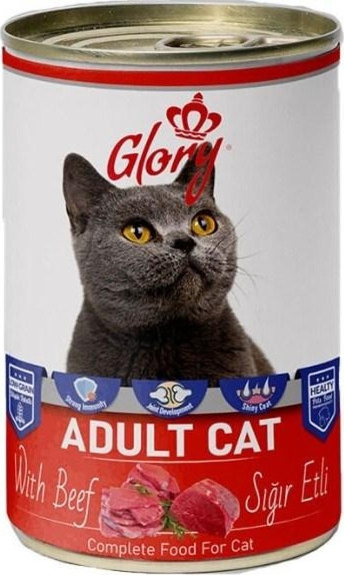 Glory Kedi Yaş Mama, Kediler için özel olarak geliştirilmiş özel sos içinde parça sığır eti içeriğine sahip besleyici ve lezzetli konserve kedi maması çeşitlerindendir.