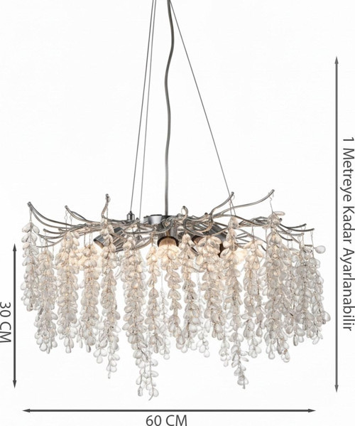 - Sanatsal Tasarım: Gümüş metal dallardan sarkan kristal damlalar, mekana modern bir sanat eseri havası katar.