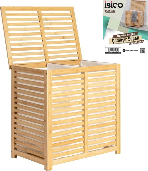 LAUNDRY BASKET 2 BÖLMELİ AHŞAP BAMBU KİRLİ ÇAMAŞIR SEPET KUMAŞ ÇANTALI SEPET=50X38X55CM