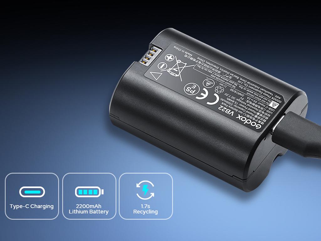 7.2 V/2200 mAh şarj edilebilir batarya, 650 tam güç patlama ve 1.7 s dolum süresi sunar. USB-C şarj desteği sayesinde çekim aralarında hızlıca şarj ederek tüm gün çalışabilirsiniz.