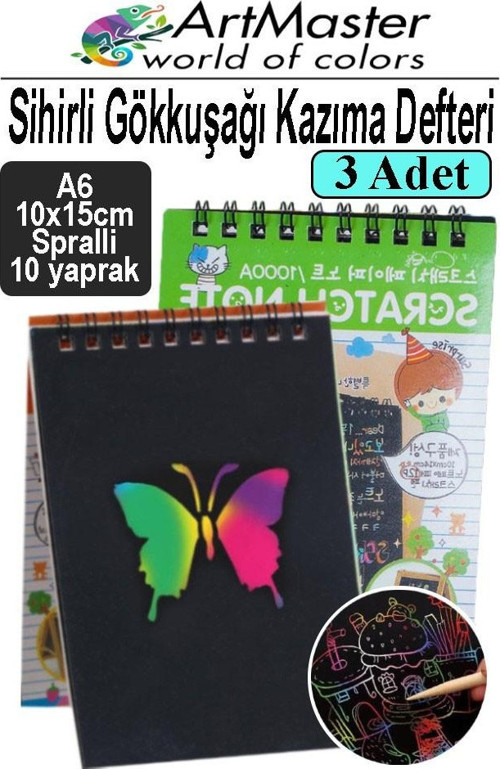ArtMaster Gökkuşağı Kazıma Defteri Sihirli A6 10x15 cm 3 Paket 10 Sayfa Spiralli Scratch Note Spralli Siyah Sihirli Resim Defteri