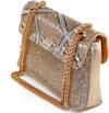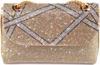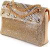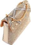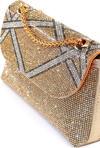 Çapraz desenli taşlı zincir kulplu çift taraflı gold abiye çanta.