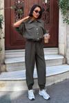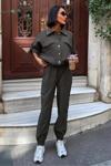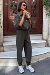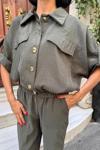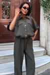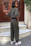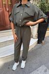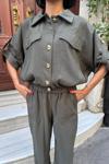 Haki rengiyle zamansız bir şıklık sunan Gold Düğme Detaylı Lastikli Rahat Takım, günlük kullanım için idealdir.