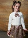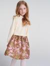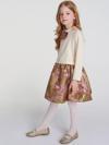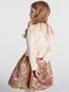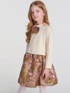 Jakar Kız Çocuk Ebisenin Üst Bedeni Esnek Örme Kuşatır. Alt Kısmı İse Altın Rengi Jakar Kumaştan İmal Edilmiştir. Yine Etek Kısmındaki Jakar Kumaştan Göğüs Kısmında Fiyon Detayı Vardır.