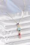 Gümüş rengin zarafetini yansıtan kolye, farklı renklerde zirkon taşlarla süslenmiştir.