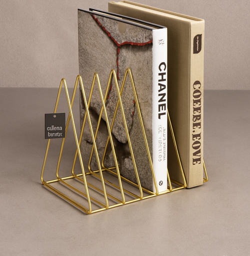 Ev ve ofislerinizde düzeni şıklıkla buluşturan gold renkli tel kitaplık organizer, kitap, dergi ve defterlerinizi düzenli tutarken dekoratif bir görünüm kazandırır. Dayanıklı metal malzemeden üretilen organizer, modern üçgen tasarımı ile hem minimal hem de estetik bir kullanım sunar.