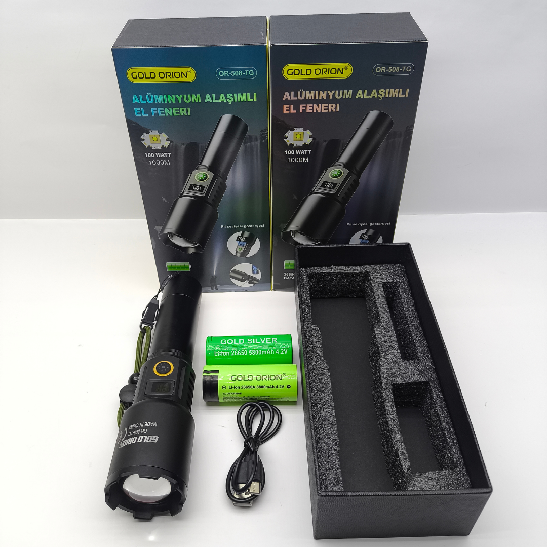 Gold Orion OR-508-TG 100W Ultra Güçlü El Feneri - Yedek 26650 Pil Hediyeli