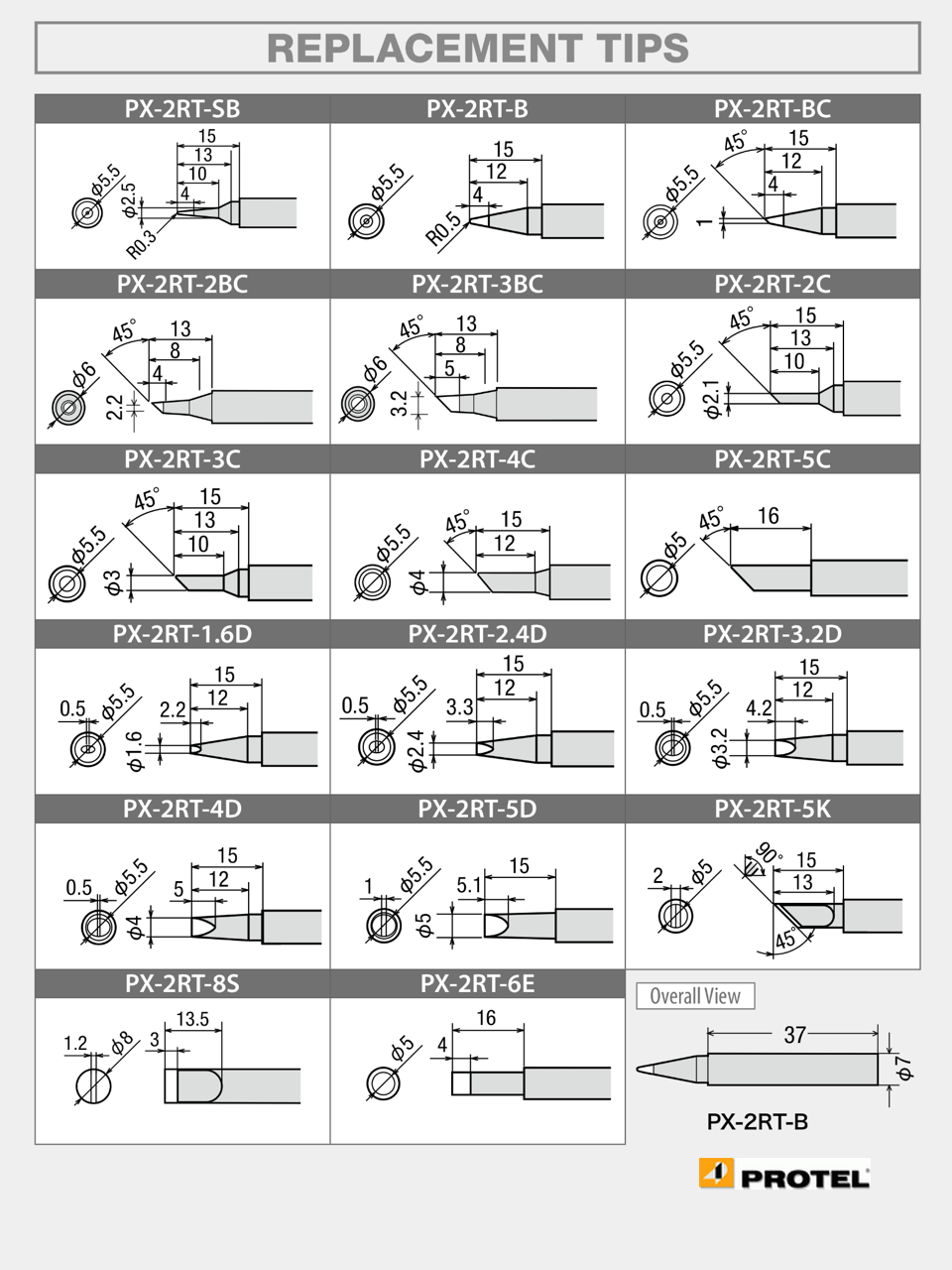 - 21 değişik çeşit havya ucu kullanma seçeneği ( PX-2RT serisi tüm uçlar uygundur)1 adet PX-2RT-SB havya ucu içindedir
