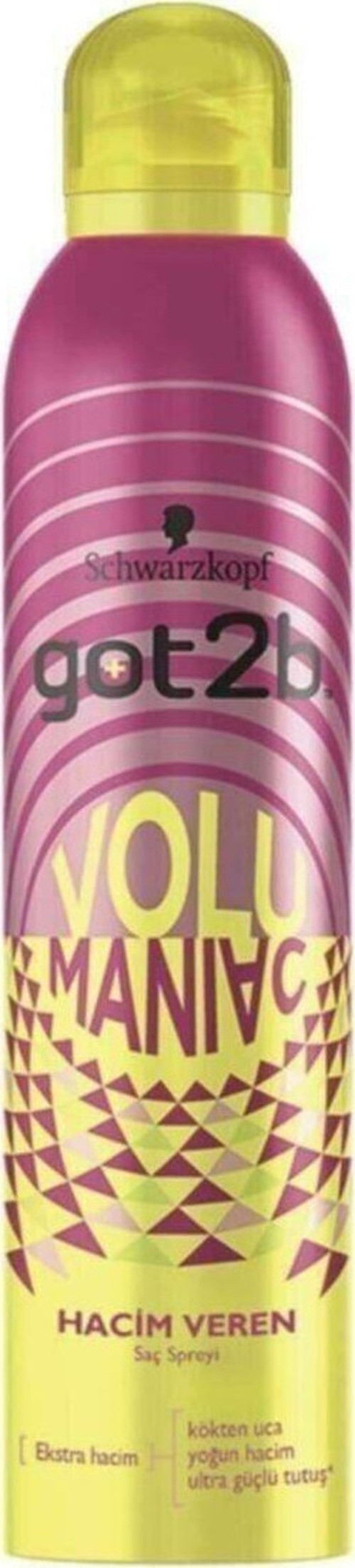 Got2b Volumaniac Süper Hacim Veren Saç Spreyirn rn En popüler saç bakım markalarından biri olan Schwarzkopf ekstra hacim isteyenler için Got2b Volumaniac Süper Hacim Veren Saç Spreyini üretir. Bu sprey saçlara kökten uça kadar yoğun bir hacim vermeye yarar. Ayrıca ultra güçlü tutuş özelliği sayesinde saçların kolayca şekil almasını ve uzun süre bozulmamasını sağlar. Schwarzkopf Got2b ile hayalini kurduğunuz dolgun saçlara kavuşabilirsiniz.