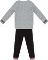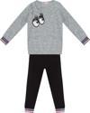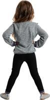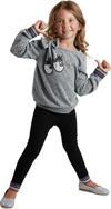 2'li tunik takım. Omuzu fiyonklu, payetlerle işlenmiş göz detaylı, kol uçları sim lastikli triko üst ve takımın tamamlayıcısı paçaları sim lastikli, parlak dokulu tayt.