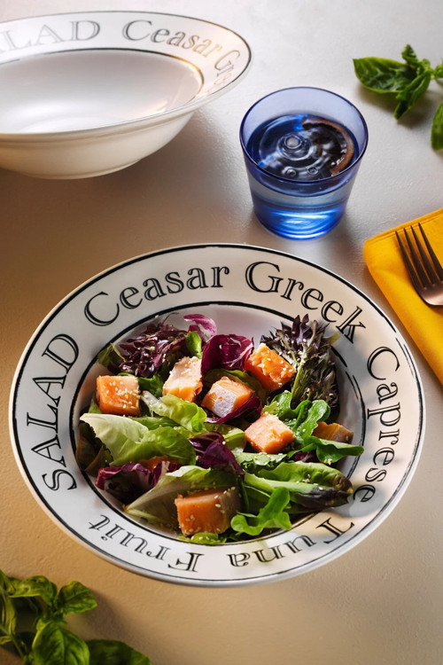Üzerindeki “Caesar, Greek, Caprese, Tuna, Fruit” yazı detaylarıyla farklı salata ve makarna çeşitlerine uyum sağlar.