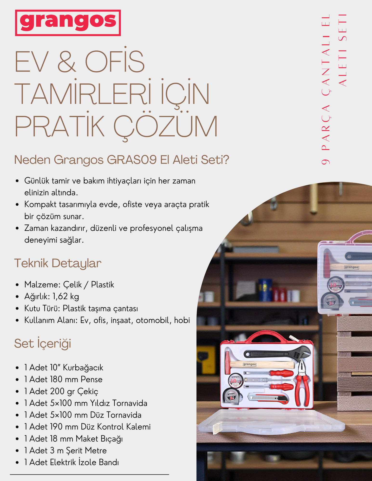 Grangos GRAS09 9 Parça Çantalı El Aleti Seti — Ev & Ofis Tamirleri İçin Pratik Çözüm