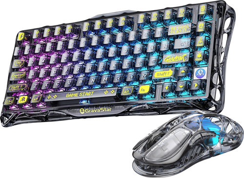 GravaStar Mercury K1 Lite+M2 Kablosuz Rgb Işıklı Mekanik Q Gaming Klavye ve Optik Mouse Seti, Şeffaf Siyah