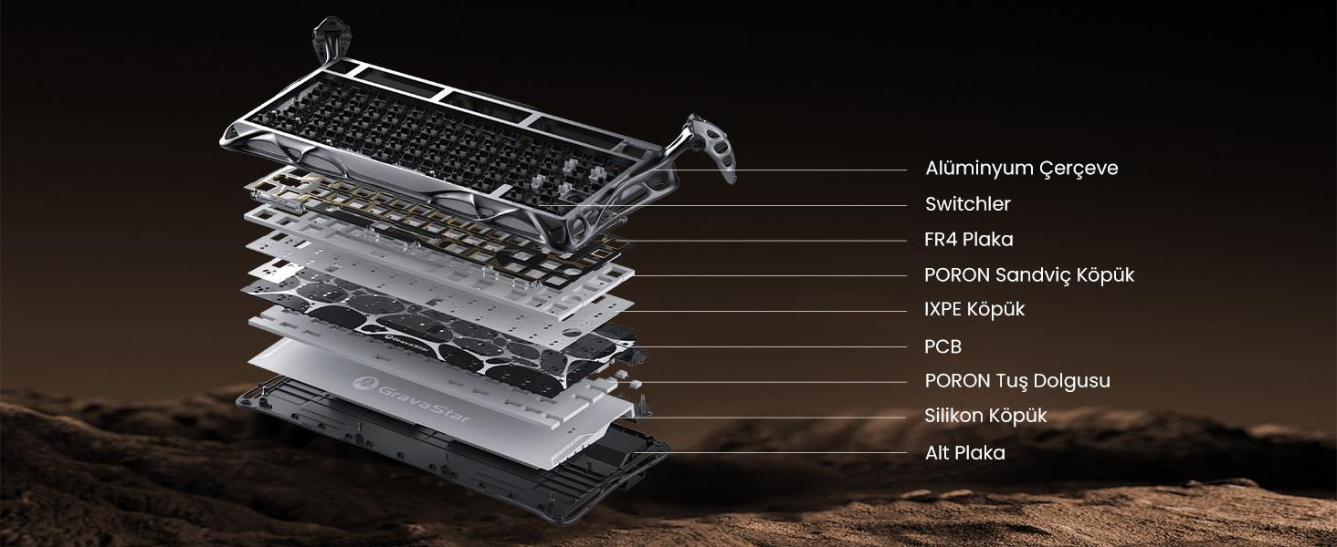 5 katmanlı yapısı ve contalı montaj sistemi, yazma hissiyatını ve ses yalıtımını üst düzeye taşır. Klavyeye yumuşak bir yazma hissi ile birlikte daha sessiz bir kullanım özelliği katar.