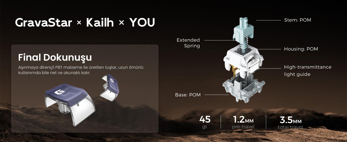GravaStar X Kailh Switch dayanıklı POK malzemeden üretilmiştir ve kullanıldıkça daha pürüzsüz bir tuş hissi sunar, temiz ve net ses üretirken yağlama gerektirmez. Yıllarca yoğun kullanımda bile 70.000.000 tuş vuruşu ömrü sunar.Dayanıklılık ve aşınma direnci için tuş kapakları PBT malzemeden üretilmiştir. Bu da her bir karakterin yıllar geçse de silinmeden aynı netlik ve parlaklıkta kalmasını sağlar.