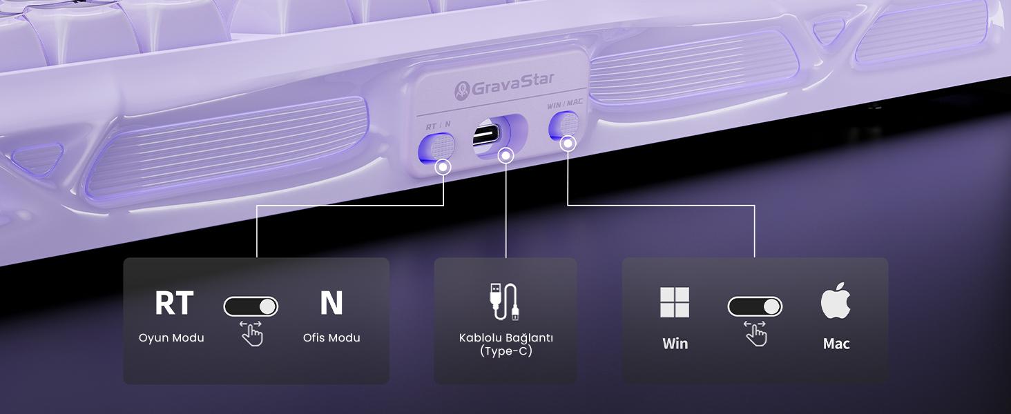 Mod değiştirme tuşunu kullanarak oyun ve ofis modu arasında kolayca geçiş yapabilir ve böylece tuş davranışlarını ya da aydınlatmayı ihtiyacınıza göre kolayca aktif hale getirebilirsiniz. Windows ve macOS ile tam uyumluluk sunması sayesinde her bilgisayarda sorunsuz biçimde çalışır. Bu özelliklerin tamamı klavyeyi çok yönlü ve kullanıcı dostu bir hale getirir.