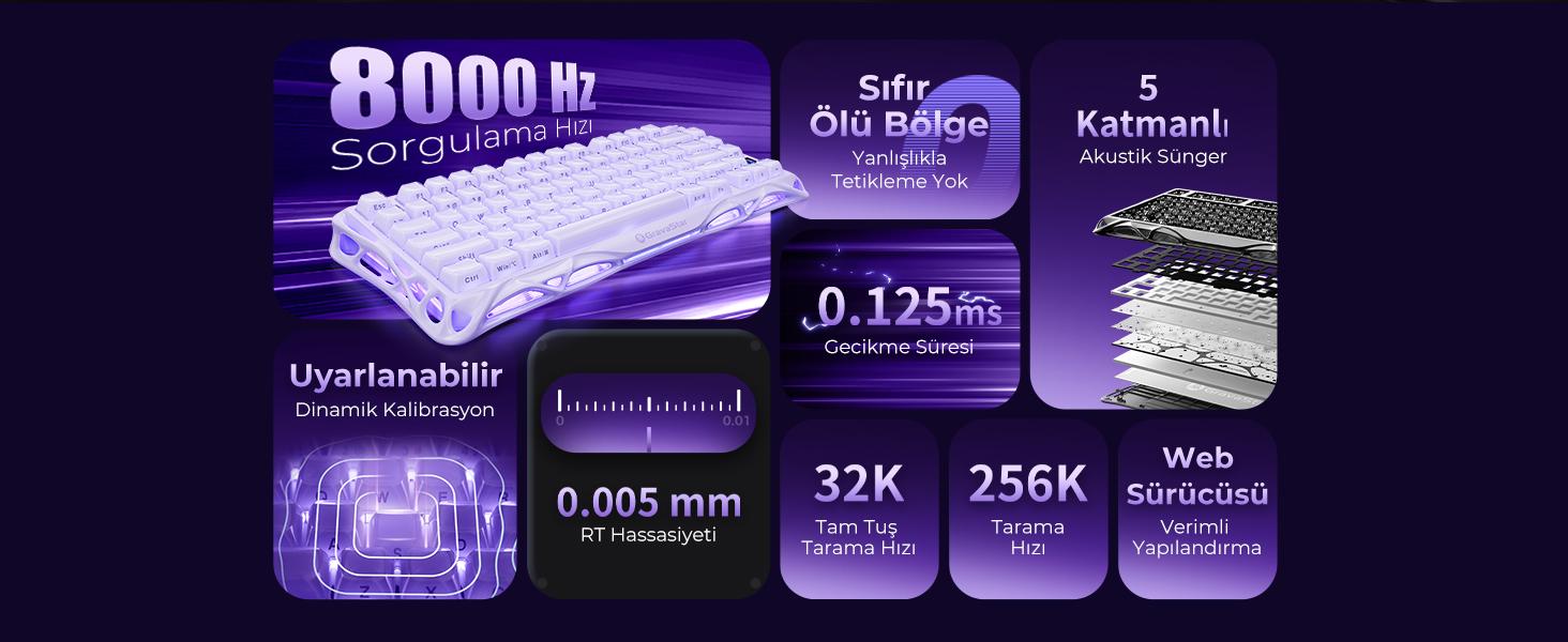 GravaStar Mercury V75 Manyetik Klavye, 8.000 Hz USB sorgulama hızı ile öne çıkar. Tuş basışını saniyesel olarak bilgisayara iletme sıklığını ifade eden bu değer, V75'in saniyede 8000 kez bilgisayara veri göndermesi anlamına gelir. Bu da klasik klavyelere göre çok daha hızlı ve kelimenin tam anlamıyla anlık tepki demektir.