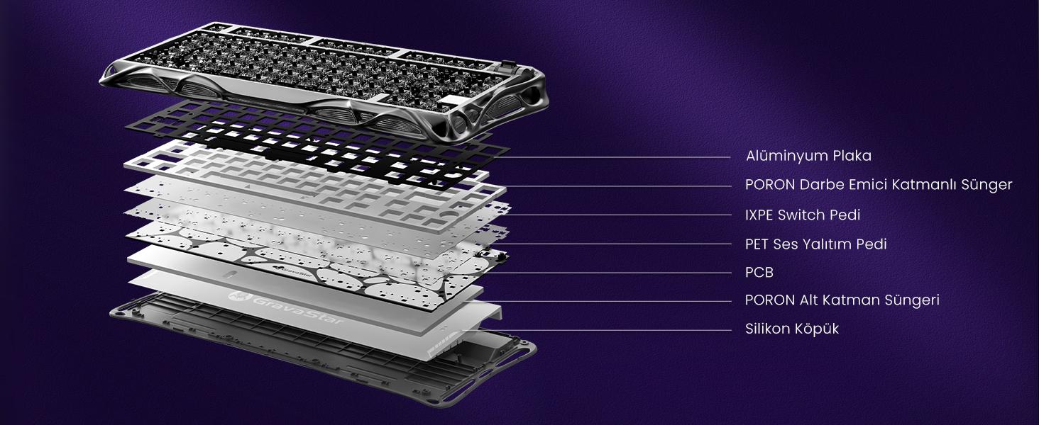 Klavyenin PBT+PC Two-Shot Molding ve PC Keycaps with Screen Printing teknolojisi ile üretilmiş tuş kapakları uzun ömürlü, dayanıklı ve silinmez özelliklidir.